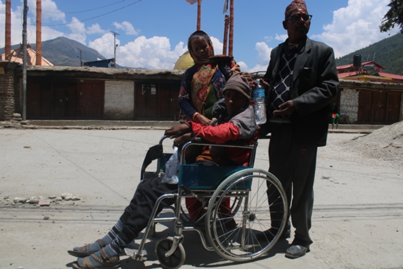 क्याप्सन :पूर्ण अशक्त अपाङ्गता भएका हरिचन्दलाई ह्विलचेयरमा उपचार गर्न अस्पताल लिदै आमा वुवा तस्बिर नेत्र शाही, जुम्ला ।