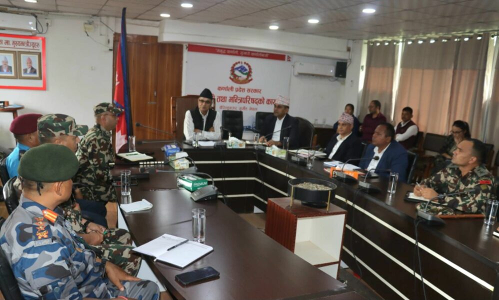कर्णाली प्रदेश सरकारका मुख्यमन्त्री यामलाल कँडेलको अध्यक्षतामा आज बसेको उक्त बैठकमा शान्ति सुरक्षालगायत समग्र अवस्थाबारे छलफल र समीक्षा गरिएको मुख्यमन्त्रीका प्रमुख स्वकीय सूर्यमणि गौतमले जानकारी दिनुभयो । उहाँका अनुसार बैठकले मुलुकको पछिल्लो परिस्थिति एवं नजिकिदै गरेको विजयादशमी, दिपावली, छठ पर्वमा यात्रु आवागमनलाई सहज बनाउनतर्फ विशेष सरोकार राख्ने निर्णय भएको छ ।