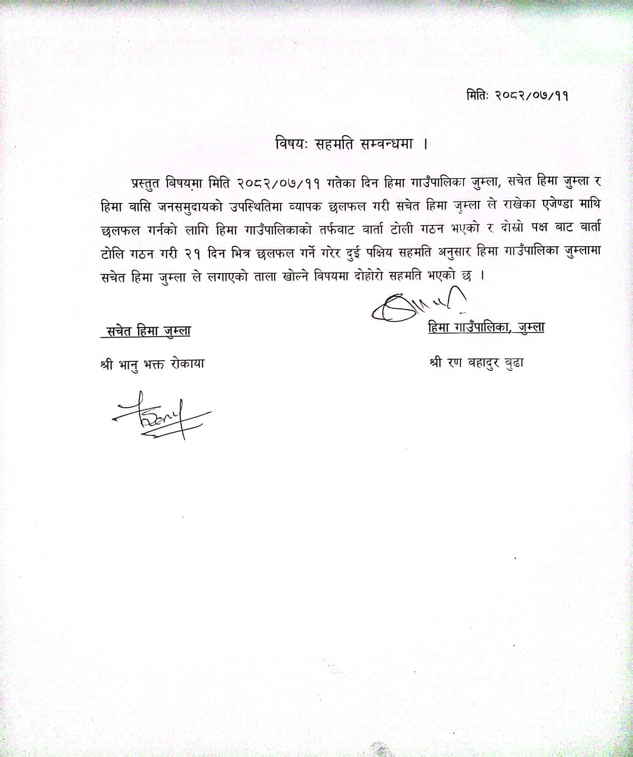 यता हिमा गाउँपालिकाले सचेत यूवाहरू सँग छलफल गरि गाउँपालिकाकाे तर्फबाट बार्ताटाेली गठन भएकाे र सचेत यूवाकाे तर्फबाट वार्ताटाेली छनाैट गरि २१ दिनमा निश्कर्षमा पुर्याईने लक्षय भएकाे प्रमुख प्रशासकीय अधिकृत रणबहादुर बुढाले जानकारी दिनु भएकाे छ ।