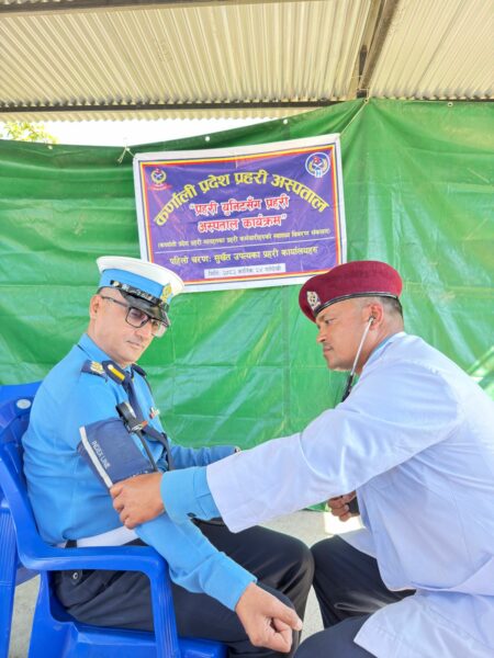 आज नेपाल प्रहरी राजमार्ग सुरक्षा तथा ट्राफिक व्यवस्थापन कार्यालय सुर्खेतमा ट्राफिक व्यवस्थापन प्रमुख प्रहरी उपरीक्षक भावेश रिमालको उपस्थितिमा अस्पताल प्रमुख प्रहरी नायब उपरीक्षक डा.लौडारी नेतृत्वको स्वास्थ्यकर्मी टोलीले स्वास्थ्य जाँच सेवालाई निरन्तरता दिएको हो । टोलीले राजमार्ग सुरक्षा तथा जिल्ला ट्राफिक प्रहरी कार्यालय सुर्खेतमा कार्यरत प्रहरी एक महिला र ४७ पुरुष गरी जम्मा ४८ जनाको स्वास्थ्य तथा बिएमआई परीक्षण गरेको हो ।
