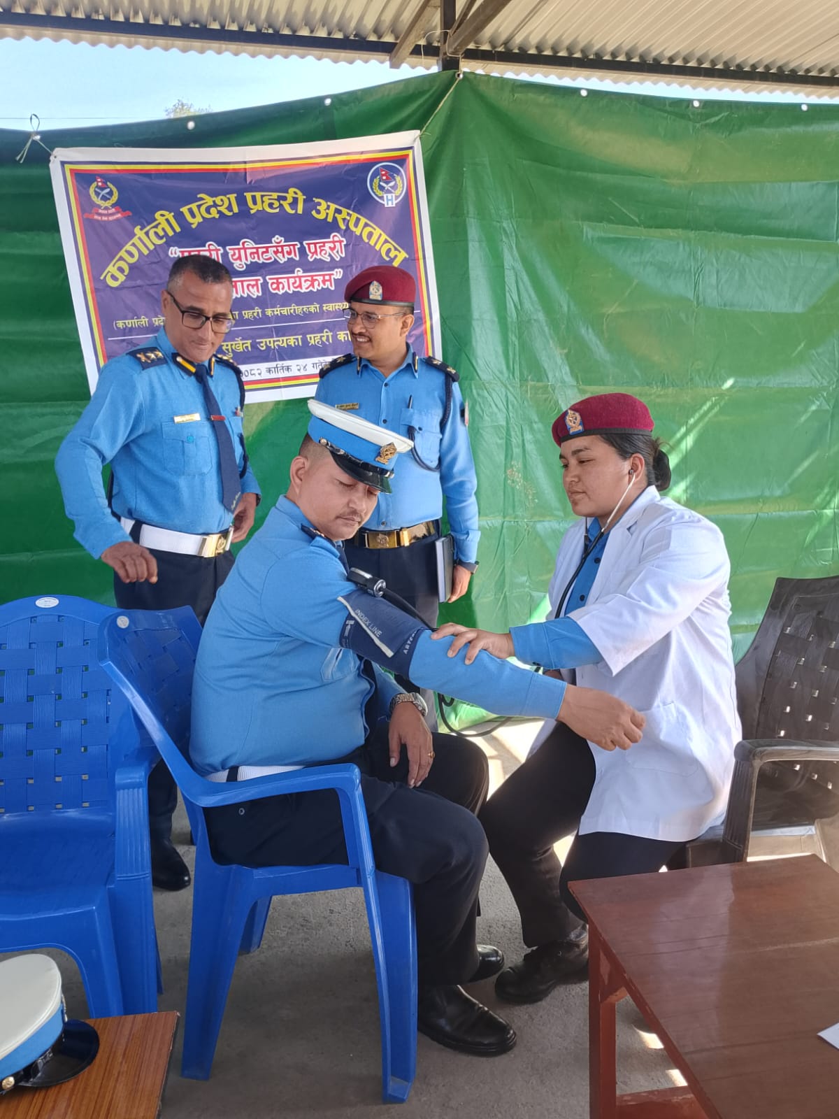 कर्णाली प्रदेश प्रहरी अस्पताल सुर्खेतको आयोजनामा “प्रहरी युनिटसँग प्रहरी अस्पताल कार्यक्रम”अन्तरगत पहिलो चरण (सुर्खेत उपत्यकास्थित प्रहरी युनिटहरु)को पहिलो दिन मंगलबार कर्णाली प्रदेश प्रहरी गण सुर्खेतमा गण प्रमुख प्रहरी उपरीक्षक प्रेमसागर केसीको उपस्थितिमा अस्पताल प्रमुख डा.श्याम कृष्ण लौडारी नेतृत्वको छ जना स्वास्थ्यकर्मी टोलीले स्वास्थ्य परीक्षण कार्य प्रारम्भ गरेको हो ।