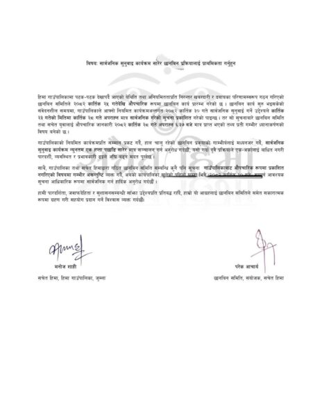 हिमा गाउँपालिकामा लामो समय देखी शुशासनको माग गर्दै आईरहेको सचेत हिमाले ३० गतेको सार्वजनिक सुनुवाई कार्यक्रम तत्काल नगर्न अपिल गरेको छ ।