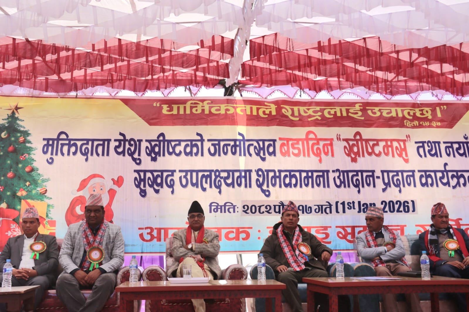 इसाई समाज सुर्खेतद्वारा आज वीरेन्द्रनगरमा ‘मुक्तिदाता यशुख्रीष्टको शुभजन्मोत्सव तथा नयाँ वर्ष २०२६’ को अवसरमा आयोजित शुभकामना आदनप्रदान कार्यक्रमलाई सम्बोधन गर्दै मुख्यमन्त्री कँडेलले धार्मिक पर्यटकीय विकासबाट कर्णालीको आर्थिक समृद्धिमा टेवा पुग्ने बताउनुभयो । उहाँले इसाईलगायतका धर्म, संस्कृति, भाषा, पहिचान र मूल्य–मान्यताबीचको सहअस्तित्वले नेपाली समाजलाई अझ सुदृढ बनाएको उल्लेख गर्नुभयो ।