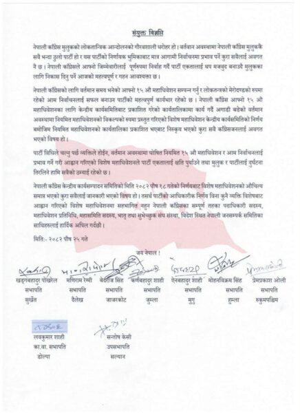 पार्टी विधि र विधानअनुसार चल्दै आएको काँग्रेस व्यक्तिको चाहनाअनुसार पार्टी सञ्चालन हुन नसक्ने, नियमित महाधिवेशन र आमनिर्वाचनलाई असर गर्ने गरी आह्वान गरिएको विशेष महाधिवेशनले पार्टी एकतालाई गम्भीर क्षति पु¥याउने र मुलुकलाई समेत अस्थिरतामा धकेल्ने स्पष्ट पार्दै उनीहरुले केन्द्रीयदेखि स्थानीय तहसम्मका सबै पदाधिकारी, सदस्य, महाधिवेशन प्रतिनिधि, महासमिति सदस्य, भातृ तथा शुभेच्छुक संघ–संस्था र विदेशस्थित नेपाली जनसम्पर्क समितिका सदस्यहरुलाई पार्टीको आधिकारिक निर्णयको सम्मान गर्न आग्रह गरेका छन् ।