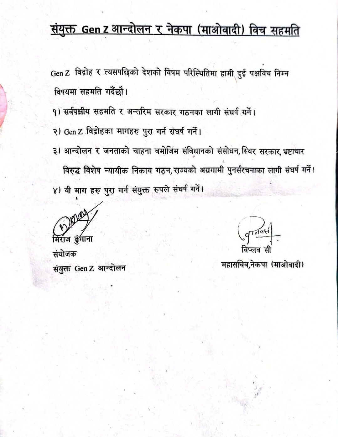 बिहीबार विप्लव र ढुंगानाबीच ४ बुँदे सहमति पत्रमा हस्ताक्षर भएको हो ।