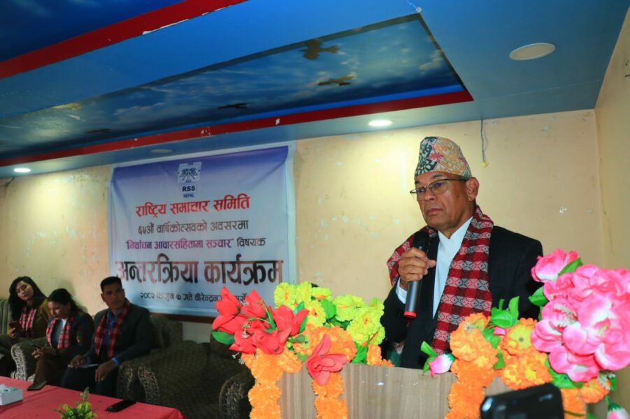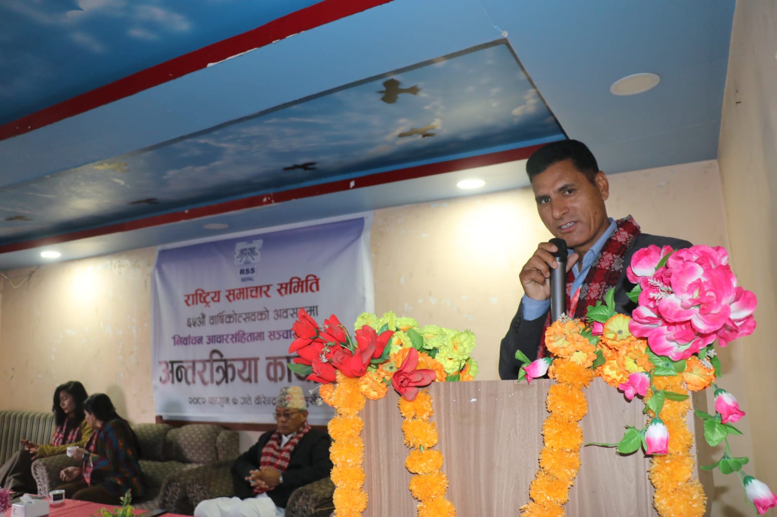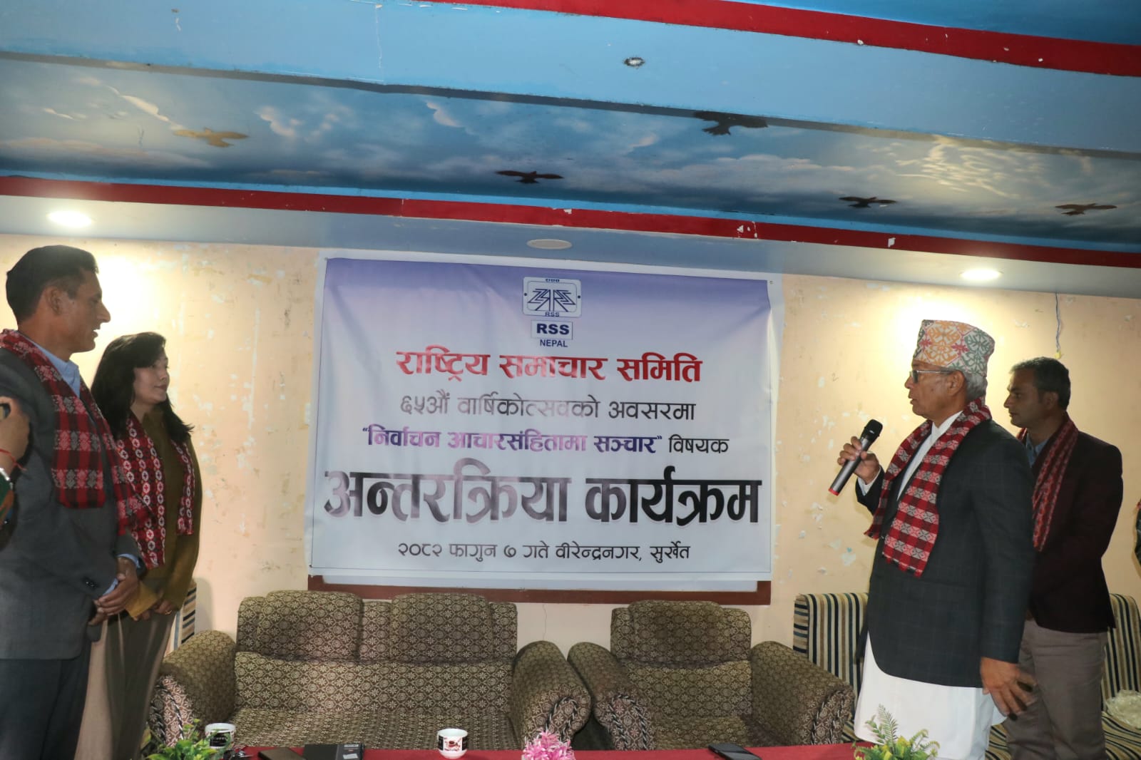 राष्ट्रिय समाचार समितिको ६५औं स्थापना दिवसको अवसरमा रासस कर्णाली प्रदेशद्वारा आज सुर्खेत वीरेन्द्रनगरमा आयोजित ‘निर्वाचन आचारसंहितामा सञ्चार’ विषयक अन्तरक्रिया कार्यक्रममा बोल्दै मन्त्री शाहले समाजलाई सचेत र गतिशील बनाउन पत्रकारिता क्षेत्रको महत्वपूर्ण भूमिका रहेको बताउनुभयो । उहाँले भन्नुभयो, “रासस मुलुकको गौरवमय ईतिहास बोेकेको समाचार संस्था हो । यसले प्रवाह गरेको सेवा स्वच्छ, भरपर्दो र विश्वसनीय छ ।”