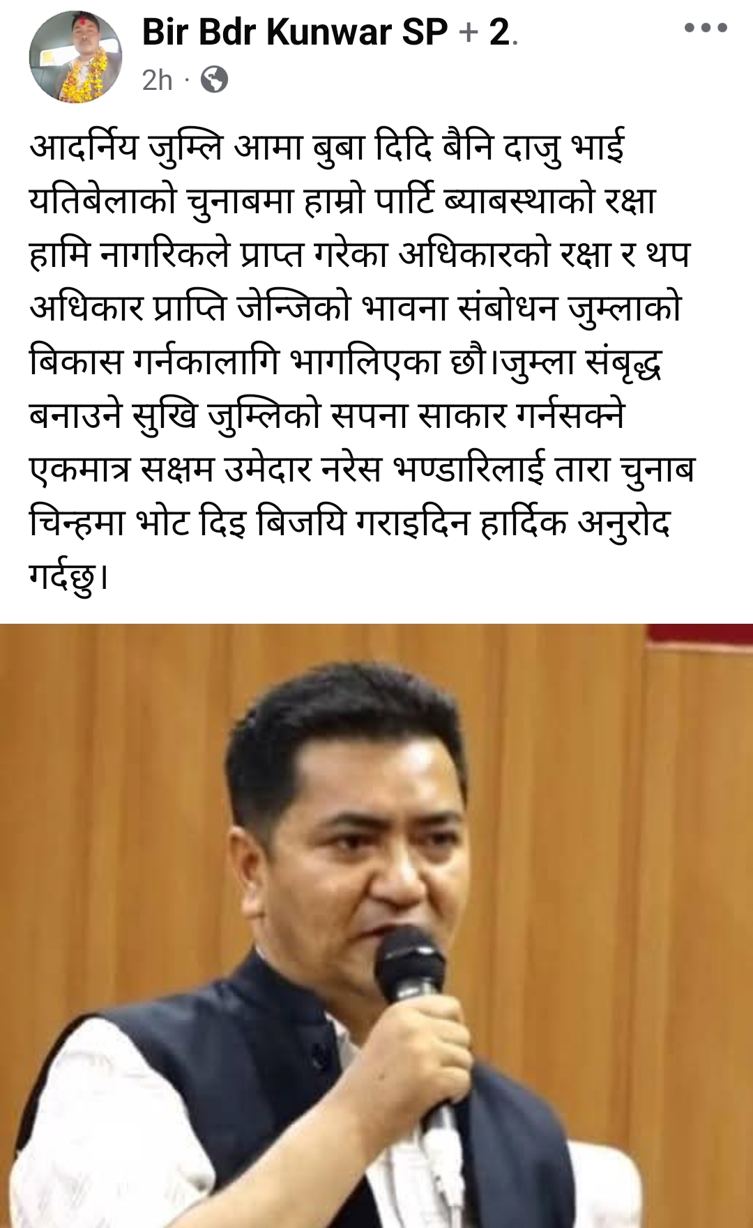 फागुन १८ गते । नेपाली कम्युनिष्ट पार्टीका केन्द्रीय सदस्य विरबहादुर कुँवर ( सुरेश पहाडी) ले व्यवस्थाको रक्षाको लागि नेपाली कम्युनिष्ट पार्टी र उम्मेद्धार नरेश भण्डारीलाई भोट हाल्न अनुरोध गर्नुभएको छ । उहाँले आफ्नो सामाजिक संजालमा लेख्नु भएको छ । आदर्निय जुम्ली आमा बुबा दिदि बहिनी दाजुभाई यतिबेलाको चुनाबमा हाम्रो पार्टी ब्याबस्थाको रक्षा हामी नागरिकले प्राप्त गरेका अधिकारको रक्षा र थप अधिकार प्राप्ति जेन्जिको भावना संबोधन जुम्लाको बिकास गर्नका लागि भाग लिएका छौं ।