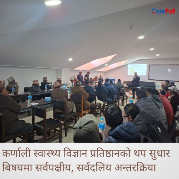 चैत ११ गते । कर्णाली स्वास्थ्य विज्ञान प्रतिष्ठान शिक्षण अस्पताल जुम्लाले प्रतिष्ठानलाई समृद्धि र विकास लागि जुम्लामा सर्वपक्षिण सुझाव संकलन गरेको छ । प्रतिष्ठानले राजनैतिकदल, जनप्रतिनिधि, नागरिक समाज, पत्रकार, सरोकारवाला निकाय सँग सुझाब संकलन गरेको हो ।