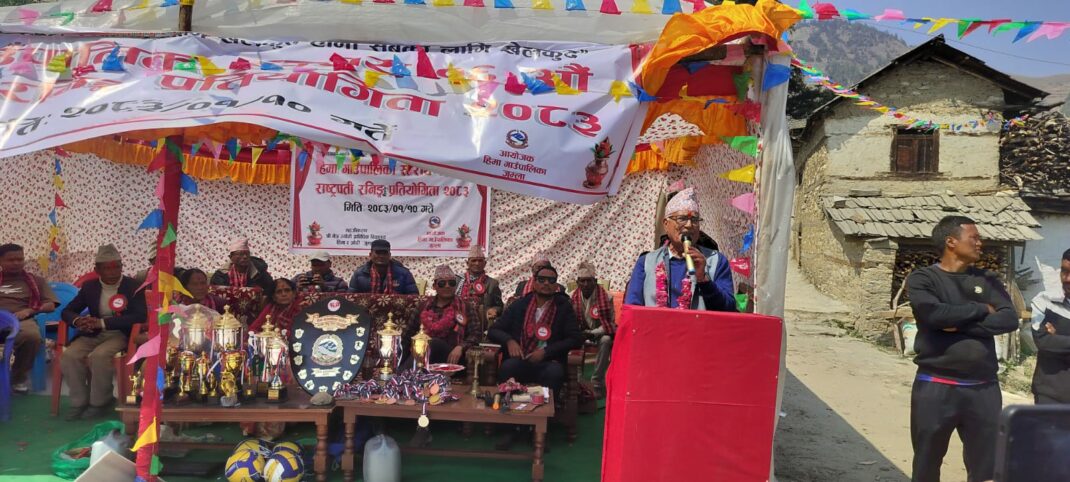 हिमा गाउँपालिका अध्यक्ष लक्ष्मणबहादुर शाहीले खेल क्षेत्रलाई प्रथामिकता दिनका राष्ट्रपति रनिङसिल्ड प्रतियोगिता हुदै आईरहेको बताउदै विभिन्न विद्याका प्रतिभावान् खेलाडी उत्पादन गर्ने धारणा राख्नु भयो । उहाँले हिमा गाउँपालिकाको दुर्गम गाउँमा पुग्नु भएकोमा प्रदेश प्रमुख जोशीलाई धन्यवाद दिनुभयो ।